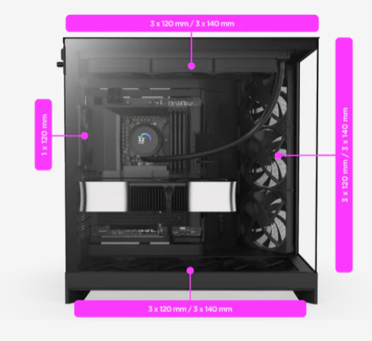 Χωράει έως και εννέα ανεμιστήρες 140 mm και έναν πίσω ανεμιστήρα 120 mm.