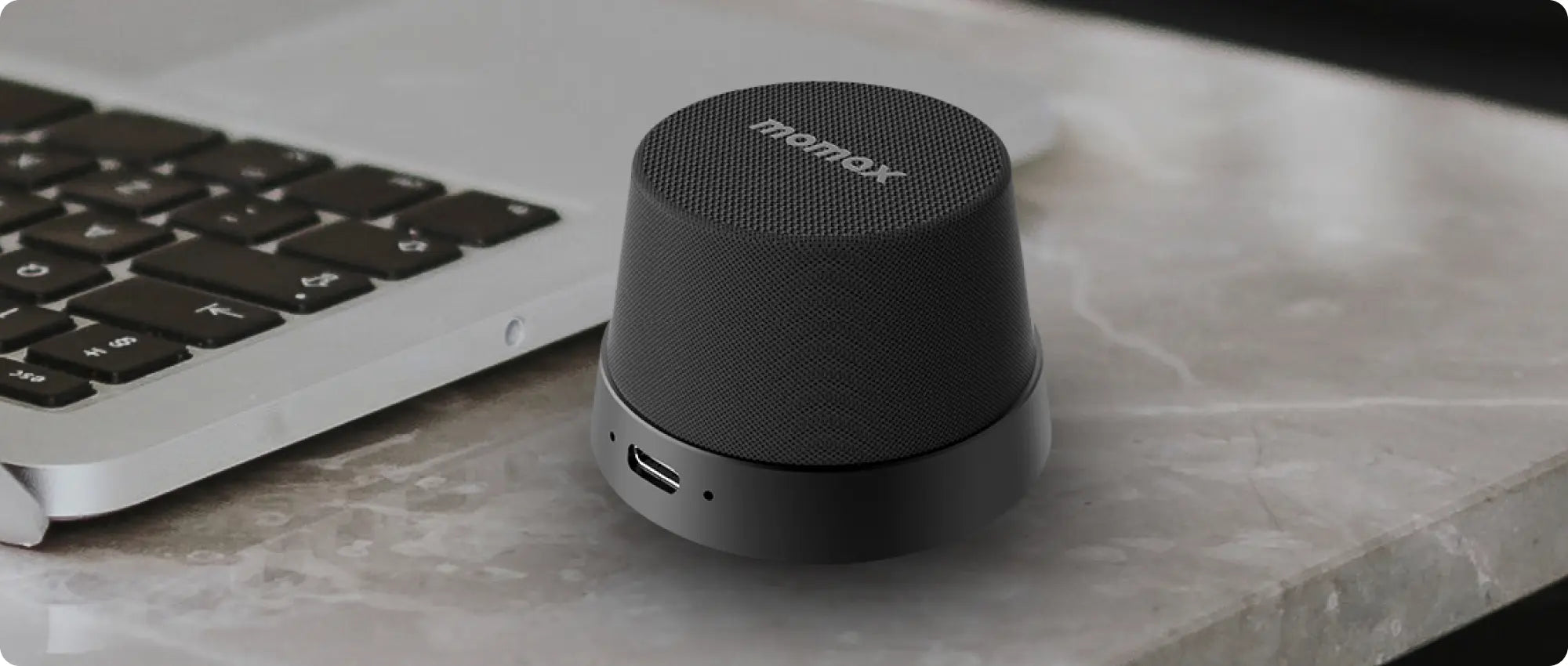 Portable audio companion with magnetic attachment, true wireless stereo, and water-resistant design.