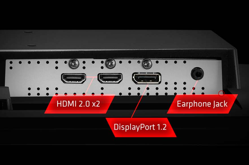 Μία θύρα Displayport 1.2 υποστηρίζει ρυθμό ανανέωσης έως και 180Hz. Δύο επιπλέον θύρες HDMI 2.0 είναι διαθέσιμες για δευτερεύουσες οθόνες και συμβατές κονσόλες. Επιπλέον, τα δύο ενσωματωμένα ηχεία και μία έξοδος ακουστικών 3,5 mm προσφέρουν στους παίκτες μια καλύτερη εμπειρία παιχνιδιού.